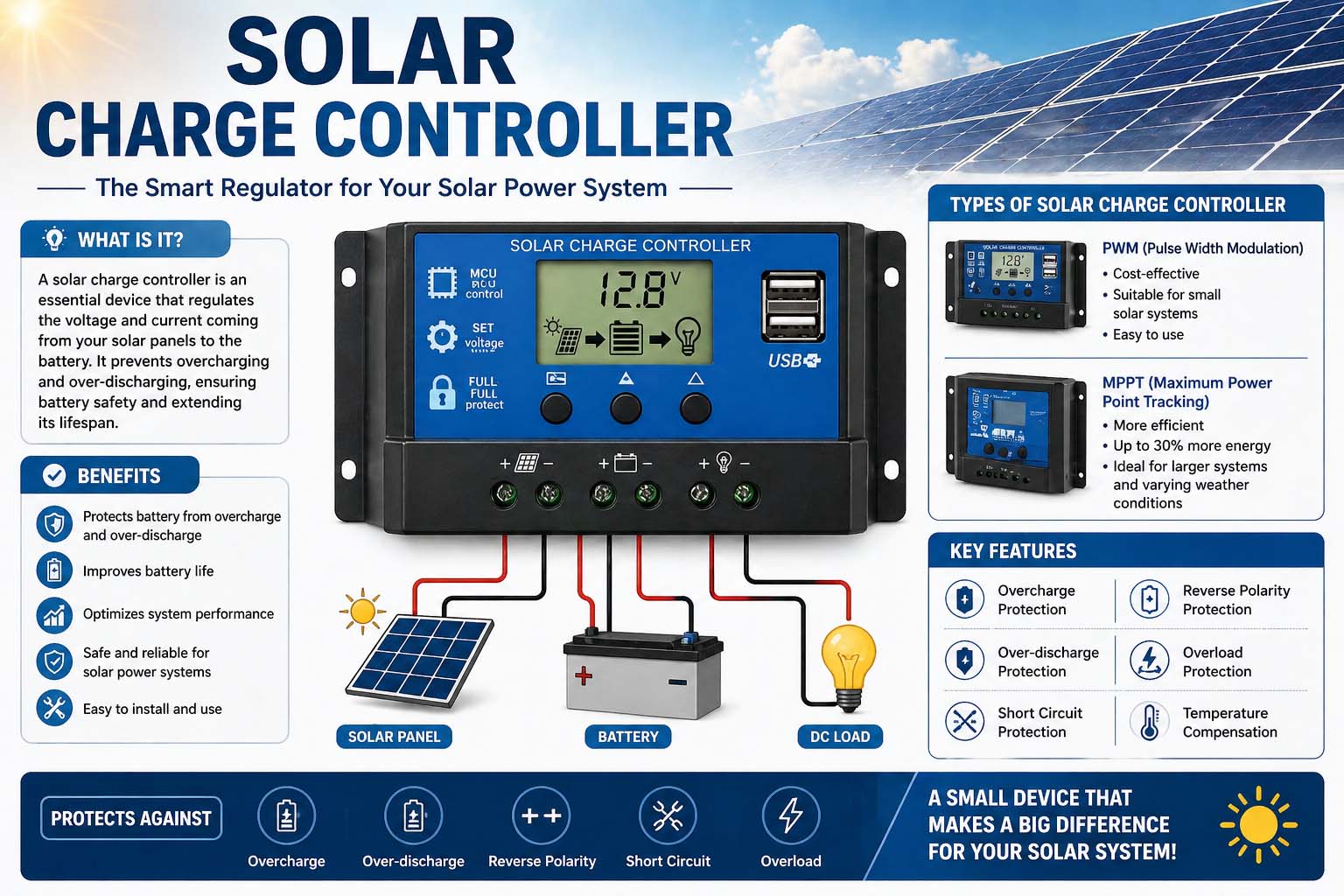 Many beginners focus only on buying solar panels and batteries, but the controller is equally important. It provides several key benefits: